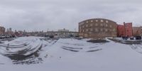 this picture is taken on a camera outside of buildings in the snow and car parking