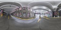 A vibrant urban art district in Detroit, USA. Graffiti-covered train station walls lead to an underpass entrance. The colorful murals and street art create a unique atmosphere in this metropolitan area.