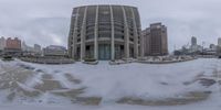 an image of a big building surrounded by snow on a cloudy day and the building is in front of it