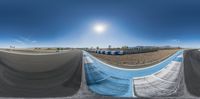 several images of a dirt race track with the sun over them and a blue pool