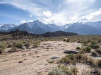 A dirt road winds through the picturesque Alabama Hills in California, USA. The desert landscape features gravel paths, mountainous backdrops, and endless clear skies.