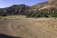 An open dirt road winds through the desert landscape of Utah, leading into a mountainous valley. The rugged terrain of Canyonlands is highlighted by red rock and steep slopes. Clear skies and vegetation add to the natural beauty of this unique destination.