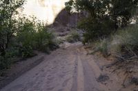 A dirt road winds through the scenic desert landscape of North Wash in Canyonlands, Utah. The road is flanked by red rock walls, showcasing the natural beauty of the area.