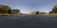a 360 - degree photo shows an intersection on a dirt road with a few trees