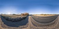 this is a panoramic view of the dirt road at an intersection with a barn in the background