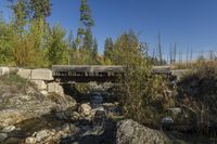 This image captures a small bridge in British Columbia's Okanagan Valley. The bridge is situated amidst a picturesque landscape, with trees, grass, and shrubs surrounding it. The clear sky above adds a touch of tranquility to the scene. In the distance, the land lot showcases a natural formation of bedrock and vegetation. This photo represents a beautiful day in East Kelowna, Canada, offering a glimpse of the natural beauty that this area has to offer.