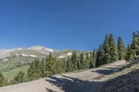 A scenic view of a dirt road running down the side of a majestic mountain range and leading into a beautiful valley below. The photograph captures a serene day with clear blue sky and a visible shadow cast by the mountains. The rugged wilderness of the mountain landforms is complemented by the surrounding trees and leaves, adding a touch of greenery to the scene. The road, winding its way through the mountains, serves as a path to explore this picturesque mountain pass. The image showcases the beauty of nature in this breathtaking mountain landscape.