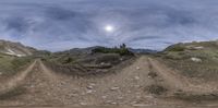 a wide angle panoramic view of a dirt road near a mountain with a sky background