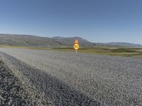 A scenic view of an asphalt road winding through the rugged mountains and open grassy plains of Iceland. The clear sky above enhances the beauty of this European island landscape.
