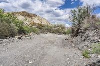 a dirt road with rocky and grassy hills in the back ground and trees in the front