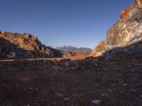 This is an image of a rugged mountain road in Yunnan, China. The landscape resembles the surface of Mars with its rocky formations and badlands. The road cuts through the mountain range, offering an off-road adventure in the wilderness. The clear sky above contrasts with the gravel surface of the track. This photo captures the natural beauty and geology of Shangri-La in Yunnan, China. It is a perfect representation of the open spaces and rugged terrain of this Asian region.