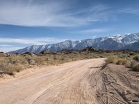 Explore the rugged dirt tracks of Alabama Hills in California under a clear sky. This USA desert landscape is characterized by gravel roads surrounded by mountains. Ideal for off-road adventures.