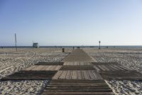 A low angle view of a straight road leading down to the coastal shore of Santa Monica beach in Los Angeles, California, USA. The road is made of wooden walkway boards contrasting against the sandy surface of the beach. The open space of the ocean stretches out to the horizon, with waves gently crashing onto the shore. In the distance, a pier can be seen extending into the sea. The combination of the wooden walkway, the sandy beach, and the endless ocean creates a serene and peaceful atmosphere.