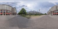 several building along a city street in the day time 360 - view technique, showing the intersection with the circle of building