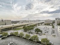 the view from the roof of an overpass above a parking lot with cars parked on it