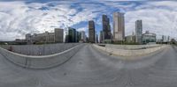 this is a panorama of an urban area with people skateboarding or skating in the park