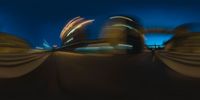 A blurred image of city lights in downtown Chicago, Illinois. The upside-down skateboarder adds a sense of motion and adventure. The reflection of the city lights on the water creates a mesmerizing atmosphere.