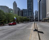 This is an image of a cityscape in downtown Chicago, Illinois, USA. The clear sky provides a beautiful backdrop to the iconic skyscrapers and buildings that fill the metropolitan area. A road with asphalt lanes can be seen running through the urban landscape, creating a bustling thoroughfare. This photo captures the vibrant energy of the city during the day, showcasing the architectural marvels and the bustling human settlement. The skyline of Chicago is a testament to the modern urban development and the unique charm of this iconic American city.