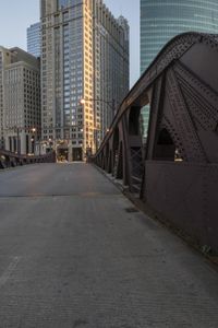 A view of downtown Chicago, Illinois at dawn. The clear sky creates a beautiful backdrop for the cityscape, with its high-rise buildings and iconic skyscrapers. The concrete streets and bridges add to the urban architecture.