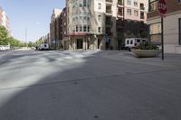 a street view of a wide city street with buildings and cars behind it and a stop sign