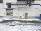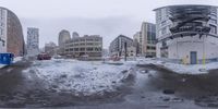 several tall buildings on the side of a street with cars and buses behind it with snow