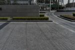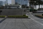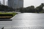 A wide shot of Downtown Dubai's city park, showcasing its impressive architecture and urban infrastructure. The clear sky reflects off the surrounding skyscrapers and water features. An open space with straight roads and lush greenery creates a serene atmosphere in this metropolitan area.