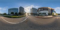a wide angle image showing a building complex with an empty road in front of it