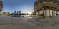 Downtown Los Angeles, bathed in the early morning sunlight. The circular mirror reflects the city skyline and buildings, creating a mesmerizing reflection on the pavement. A perfect blend of urban design and natural beauty.