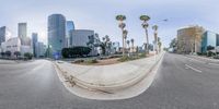 A fisheye lens captures the vibrant city life of downtown Los Angeles. Palm trees line the wide city street, leading to a long stretch of road. The urban metropolis is filled with high-rise buildings, condominiums, and skyscrapers, creating a stunning cityscape.