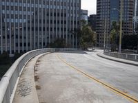 a city street is deserted with an empty walkway next to it and skyscrapers in the background