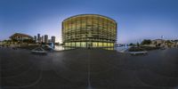 A night view of a modern high-rise building in downtown Los Angeles. Its glass walls reflect the passing car, creating a mesmerizing reflection in the circular pool. The city's skyline and clear sky add to the metropolitan charm.