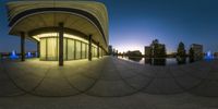 A mesmerizing fish eye view of a high-rise building in downtown Los Angeles. The modern architecture stands tall against the clear sky, with light reflecting off its glass walls. A stunning representation of urban design in the bustling metropolis.