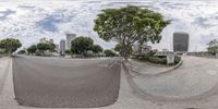 a reflection in a fish eye lens on the ground of a parking lot with trees and buildings