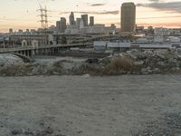A picturesque view of downtown Los Angeles at dawn. The city's skyline reflects on the calm river, surrounded by buildings and bridges. In the foreground, a road leads to a suburban area with open spaces and rugged terrain.