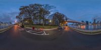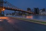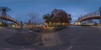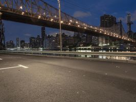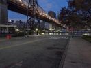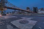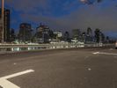 A view of downtown Manhattan at dawn. The city skyline is illuminated by the soft light of the rising sun. Modern architecture, skyscrapers, and the iconic Brooklyn Bridge dominate the cityscape. The busy intersection below showcases the bustling metropolis.
