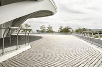 A view of a modern architecture building in downtown Milwaukee, Wisconsin. The futuristic design stands out against the urban landscape. Clouds fill the sky above as tourists explore the museum and walk along the cobblestone road.
