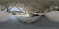 A fisheye view of a modern architectural building in downtown Milwaukee, Wisconsin. The building's facade features a sleek design with glass windows and a straight walkway leading to the entrance. This high-rise is a prominent feature in the city's business district.