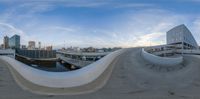 An aerial view of downtown Milwaukee, Wisconsin. The cityscape is dominated by high-rise buildings and concrete streets. The open rooftop offers a unique perspective of the urban landscape. A high vantage point captures the city's architectural beauty.