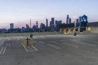 an empty parking lot with a clock tower in the background in the foreground with a view of city and skyscrapers