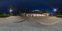 A fisheye lens captures a spherical panorama of modern architecture in downtown Toronto. The city skyline is illuminated by artificial light, creating a dark and vibrant cityscape. The buildings, roads, and walkways create a dynamic urban design.
