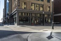 This image captures the corner of a street in downtown Toronto, Canada. The classic architecture of the mixed-use buildings and office buildings adds to the charm of the neighborhood. The clear sky above reflects in the windows of the buildings, creating a beautiful urban landscape. With no traffic, pedestrians, or motorcycles in sight, the road surface and curbs are clearly visible. The hard shadows cast by the buildings add depth and contrast to the scene. This photo represents the quiet atmosphere of a bustling city during the day.