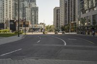 A stunning view of downtown Toronto at daybreak. Tall modern buildings line the straight road, with cars and a bus visible in the distance. The clear sky showcases the city's vibrant urban design.