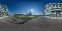 A fisheye view of a bustling street corner in downtown Toronto. The urban landscape is filled with high-rise buildings and office complexes. The clear sky and well-maintained infrastructure add to the city's appeal.