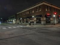 an empty city street with buildings and a traffic light at night time a red light shines above the building