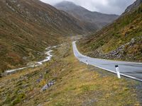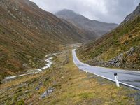A gloomy and dramatic landscape in Europe, featuring a winding road surrounded by wet terrain and grey skies. The mountain range provides a dramatic backdrop to the scene. Explore the highlands of Austria on this gloomy day.