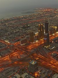 A dramatic aerial view of Dubai, the modern metropolis with its iconic skyscrapers and stunning cityscape. The city comes alive at night, illuminated by the lights of the bustling streets and buildings. A captivating sight from an elevated viewpoint.