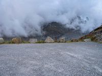 A gloomy and dramatic landscape in Austria. The grey sky adds to the overall gloominess. The fog creates a sense of mystery. The gravel road leads to the mountain slopes, offering a recreational activity in this destination in Europe.