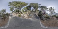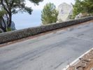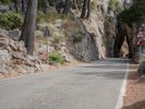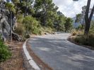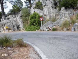 A scenic coastal road in Spain, surrounded by lush vegetation and towering mountains. The road curves through a landscape of rock formations and tree-lined pathways. The clear sky and sunlight create a dynamic and fast-paced atmosphere. Explore the beauty of the Balearic Islands.