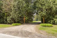 A photo of a driveway in Toronto, Ontario, Canada. The driveway is surrounded by lush green vegetation and is lined with trees, providing shade and a beautiful landscape. The road surface is asphalt, and there is a curve in the path. The entrance to the driveway is marked by an orange gate. It is a peaceful and nature-filled location.