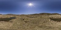 a view of the sun over the fields of dry grass, and there's a little stream in front